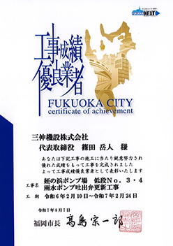 2025年8月7日福岡市より工事成績優良業者表彰を受けました 福岡市より工事成績優良業者として表彰されました。 (工事名)姪の浜ポンプ場 低段№3・4雨水ポンプ吐出弁更新工事 (工 期)令和6年2月10日~令和7年2月24日